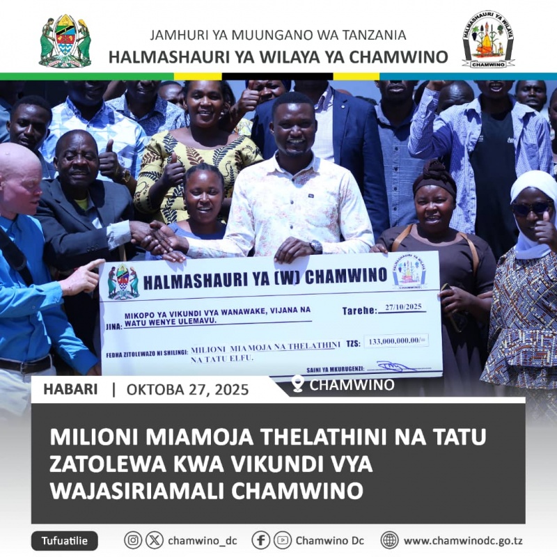 Leo Oktoba 27, 2025 Halmashauri ya Wilaya ya Chamwino imetoa mikopo ya Tsh. 133,000,000 kwa vikundi 24 vya wajasiriamali, ambavyo vimejumuisha vikundi 10 vya vijana, vikundi 13 vya wanawake na kikundi 01 cha walemavu, ikiwa ni utoaji wa mkopo wa 10% kwa makundi hayo kwa mwaka wa fedha 2025/2026.